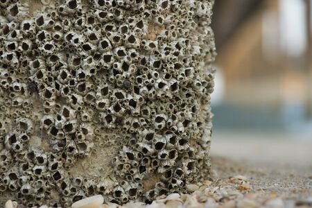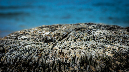 Barnacles encrusted on sandstone rock at beach. Close up.
