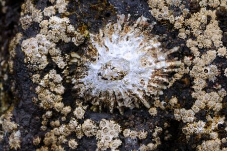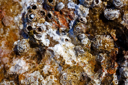 Closeup of limpets and marine organisms attached to a vibrant rocky surface along the seashore, showing wild coastal ecosystem details and textures.