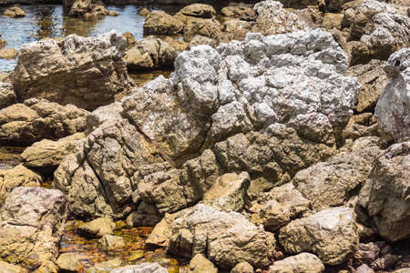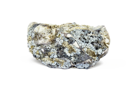 Fossilized sea creatures and shells on rocks by the sea beach.