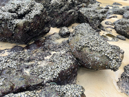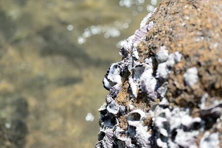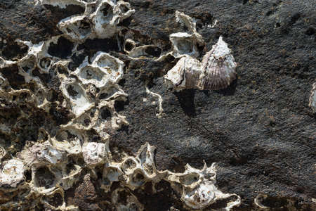 Mussels shells on stone rock on the beach texture pattern in Patong Beach Kathu District Phuket Island Province Southern Thailand in Southeast Asia.