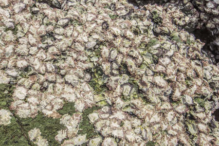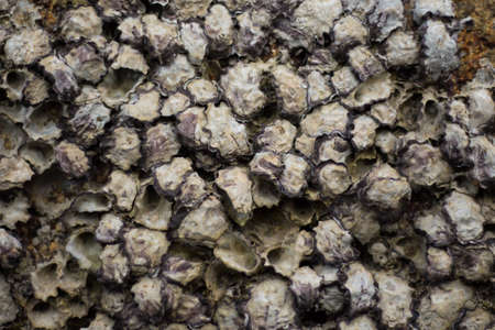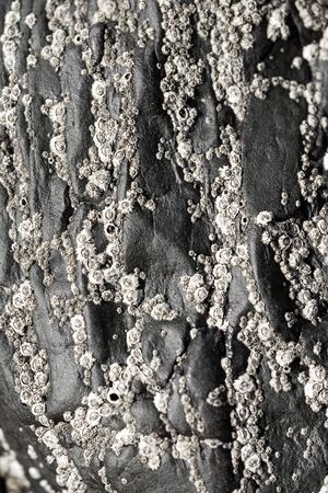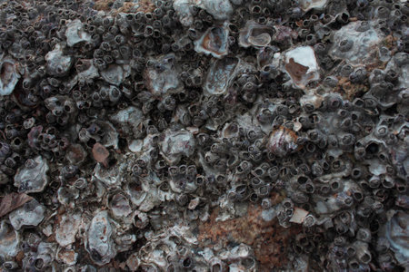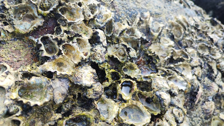 Close up of oyster shells texture on rocky surface: natural patterns and marine life details.