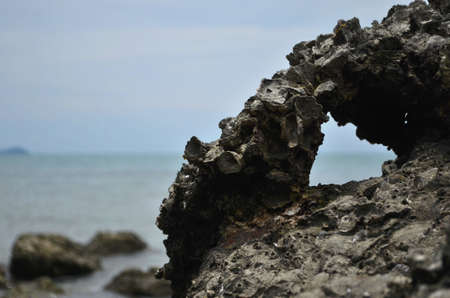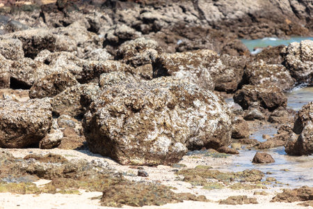 Landscape of travel place with nature at a beach and tropical sea with rock beach with oyster shell, note select focus with shallow depth of field
