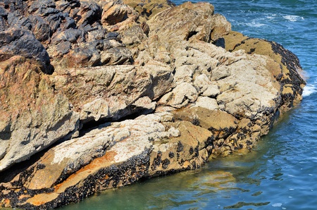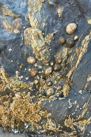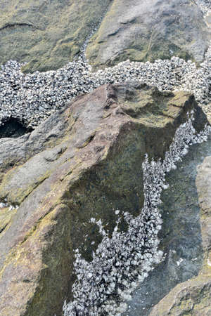 Close-up of coastal rocks covered with clusters of mussels and barnacles at low tide