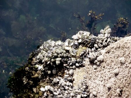 Mussels attached to the wall of the port of Vigo, Galicia. Spain
