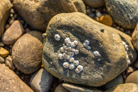Close-up of small shells attached to a rock at the beach in Invergordon, Scotland