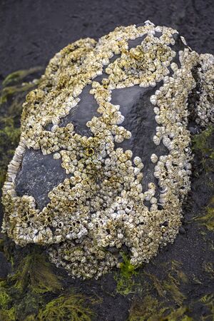 Many barnacles colonize a stone and become really visible at low tide. Seen in Iceland. Barnacles are exclusively marine, and tend to live in shallow and tidal waters, typically in erosive settings.