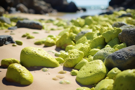 Coral Rocks Stranded: Vibrant Yellowish Green on Beach Sand - AR 3:2