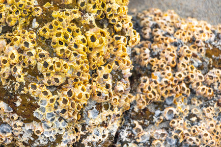 Close up of a group of barnacles on a rock by the sea