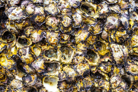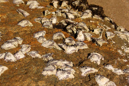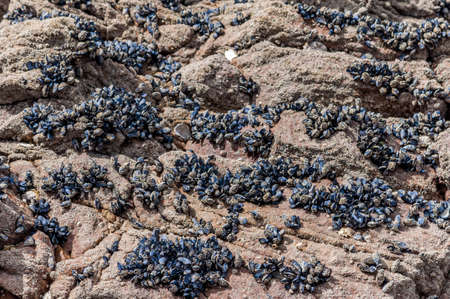 Mussels shells on stone rock on the beach texture pattern.