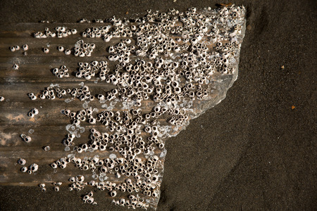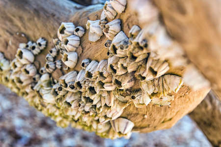 Barnacles (Balanus spp.) on a log, fouling organisms. North Black sea