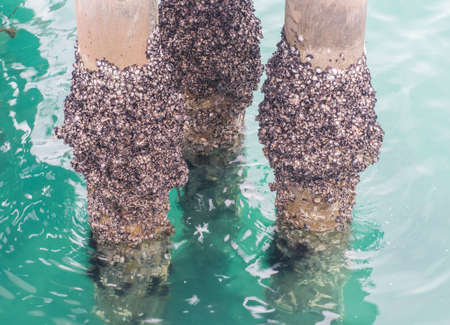The black mussels stuck on the pole in the water
