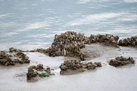 Group of live oysters shellfish growing on stones on sand at low tide in North sea, Zeeland, Netherlands