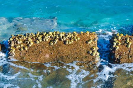 Barnacles on the submerged rock by the sea