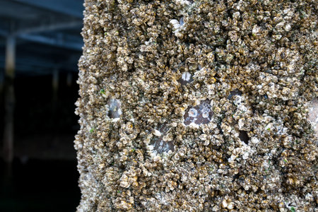 Barnacles covering a pier post near Ketchikan, Alaska