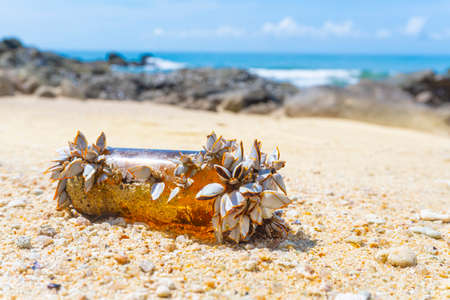 Glass bottles on the beach,Many shells are perched on bottles by the beach.