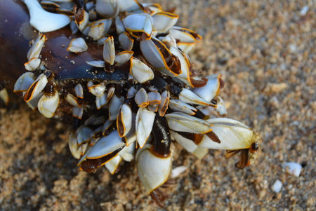 A shallow focus closeup shot of goose barnacles on a log in the beach