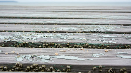 Close-up of a weathered wooden pier deck with peeling light blue paint and clusters of barnacles, showing coastal decay.
