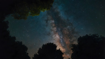 A beautiful scenery of the Milky Way galaxy in the night sky over a range of trees