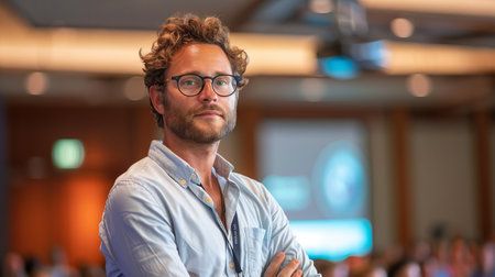 The image shows a man with curly hair and glasses, wearing a blue shirt. He is standing in a room with a blurred background. The man is looking at the camera with a serious expression.