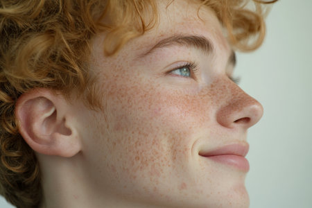 Portrait of a man model face with glowing skin and freckle on clean background. Concept of beauty and skin care.