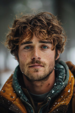 A young man from Russia gazes directly at the viewer with striking blue eyes. Tousled hair and relaxed expression. Introspection and tranquility. Portrait of a handsome man of 30 years. Generative AI.