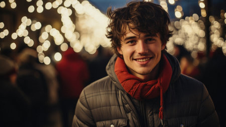 A young man beams with happiness, dressed in a smart jacket and posing against a neutral backdrop. His friendly expression radiates warmth and confidence.