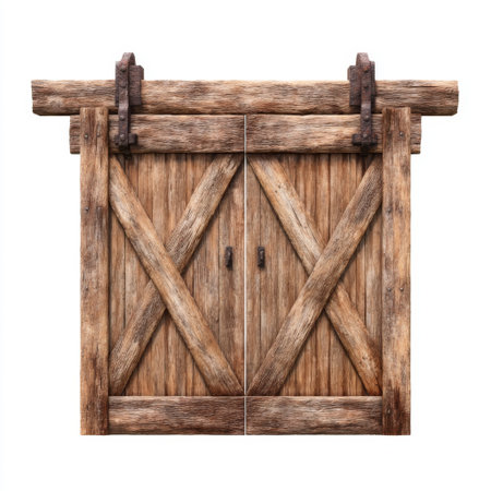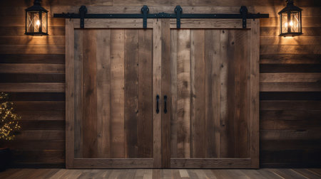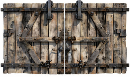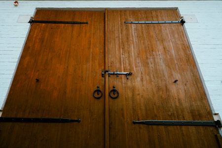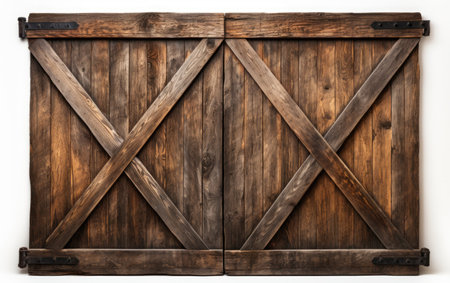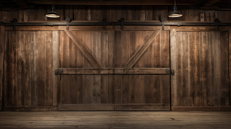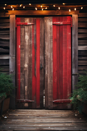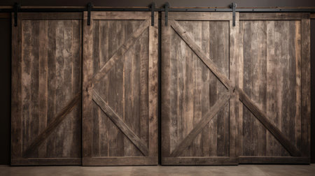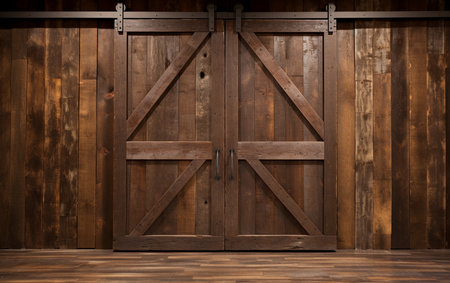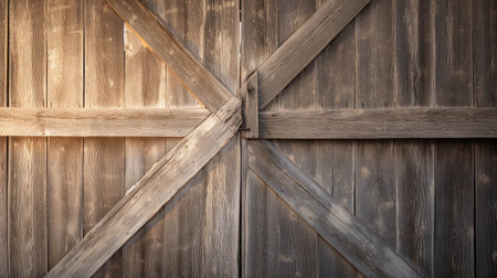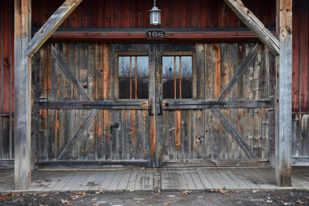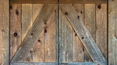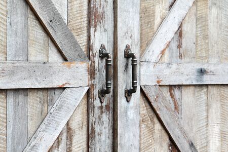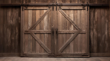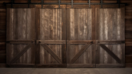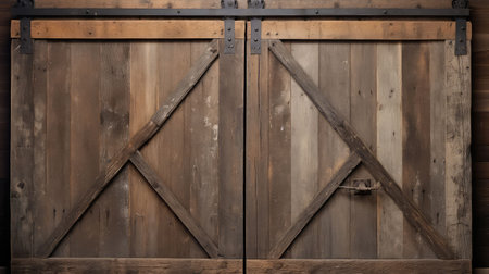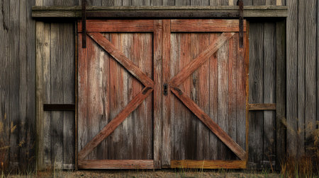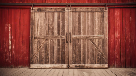Aged wooden barn doors with weathered texture and antique charm set against a red barn