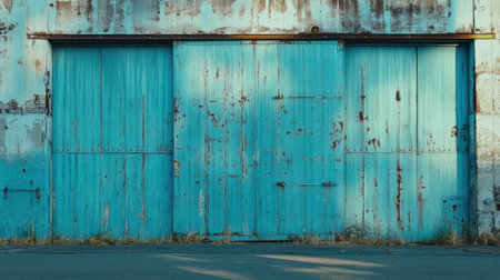 This image showcases old, weathered blue barn doors set against an industrial backdrop, featuring peeling paint and rugged texture. Perfect for designs needing rustic charm.