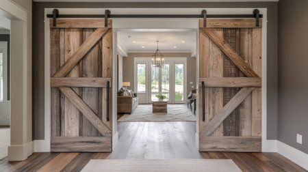Rustic wooden sliding doors create a warm entrance to a modern living space, blending traditional charm with contemporary design and inviting natural light.