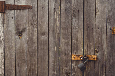 Background texture. Aged wood doors with rusty metal rivets and barn lock, copy space