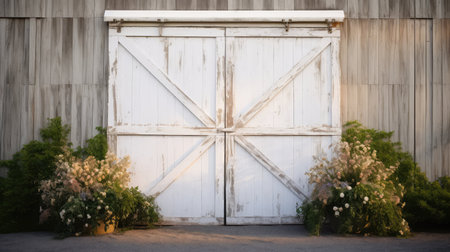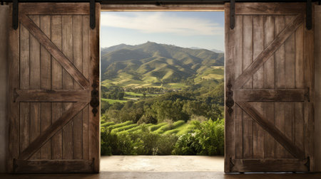 Wooden barn doors stand open, allowing soft light to filter through the slats. The warm glow highlights the rustic texture and creates a peaceful, inviting ambiance in the countryside.