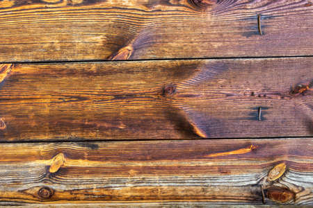 Vintage brown wood background texture with knots. Old painted wood wall. Brown abstract background. Vintage wooden dark horizontal boards. Yop view with copy space. Background for desk