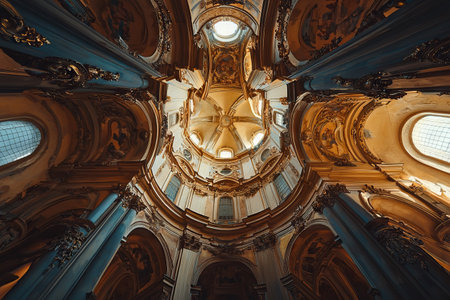 Explore an exquisite architectural interior that highlights a magnificent domed ceiling, detailed sculptures, and elegant columns illuminated by natural light.