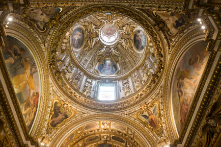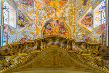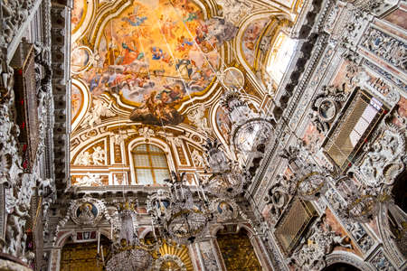Palermo, Italy April, 2018: Interiors, frescoes and splendid chandeliers in the Santa Caterina church in Palermo. The church is a synthesis of Sicilian Baroque, Rococo and Renaissance styles.