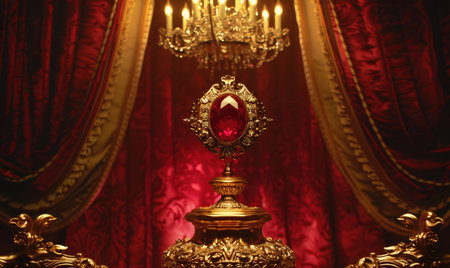 An ornate gold-plated pedestal with intricate details, presenting a ruby pendant on a luxurious velvet backdrop