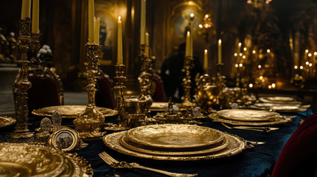 This stunning image showcases a lavish table setting adorned with golden plates and elegant candleholders, creating a warm and inviting atmosphere perfect for extravagant gatherings.