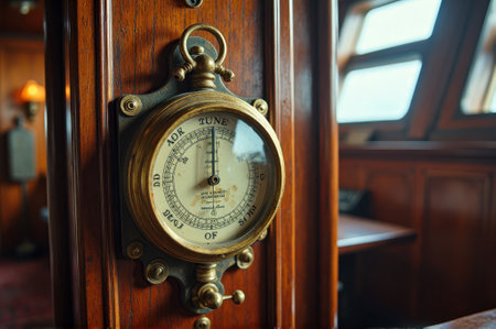 Antique brass barometer on wooden ship wall interior. That the image is generated using AI.
