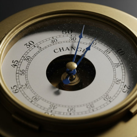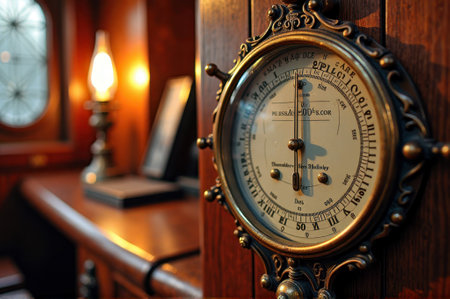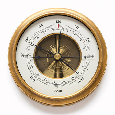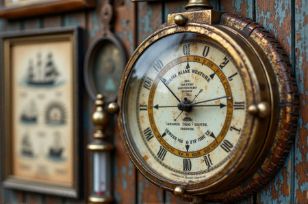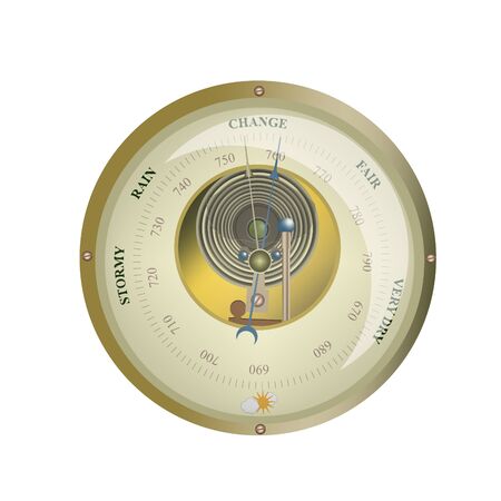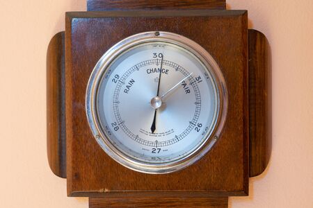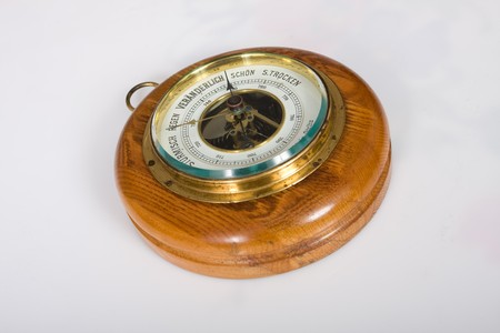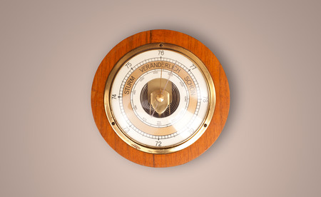 Close up of an old antique barometer indicating high pressure and fine weather.