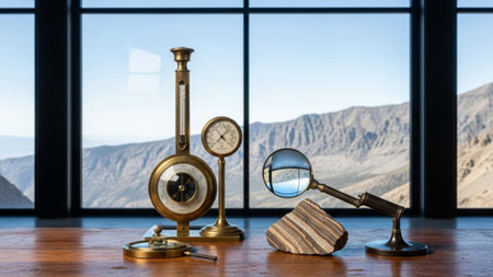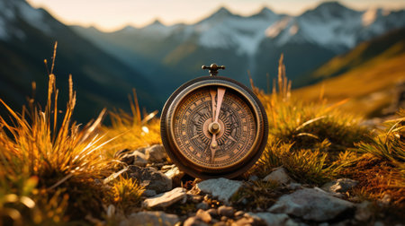 A stunning shot of a person holding a compass with a view of the mountains and an overlay of trees
