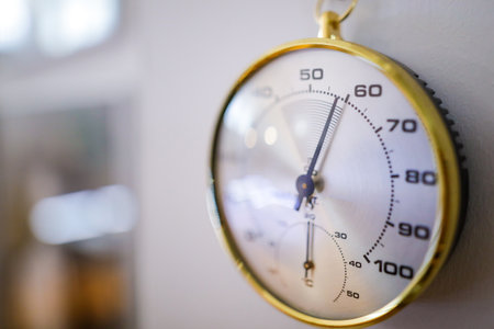 Shallow depth of field (selective focus) details with an analog hygrometer on the wall of a museum.