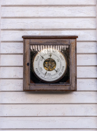 Close up of an aneroid barometer mounted on a wall