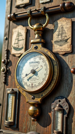 Vintage nautical barometer on old ship with weather gauges in marina. That the image is generated using AI.