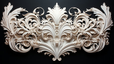 a large ornate white sculpture with intricate ornamental patterns, resembling layered organic forms. inspired by the venetian rococo painter, this sculpture stands against a black background, made of wood. the realistic details are achieved through focus stacking. this wall sculpture and installation showcases the artist's skill and attention to detail. ai generated