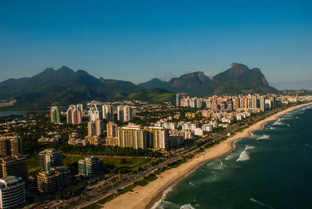 Aerial view of Rio De Janeiro's Barra Da Tijuca beachfront with Pedra da Gavea Mountain, Brazil