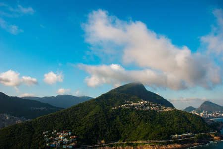 Rio de Janeiro, Brazil. Aerial view of an ocean surrounded by a complex of hills, islands and mountains with native forests and Mediterranean vegetation on the slopes. Buildings on the beaches of the coast of Rio de Janeiro.