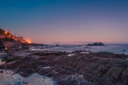 View of the beautiful sunset over False Bay from Kalkbay with little coloured houses on the beach, with mountains in the background, Cape Town, South Africa