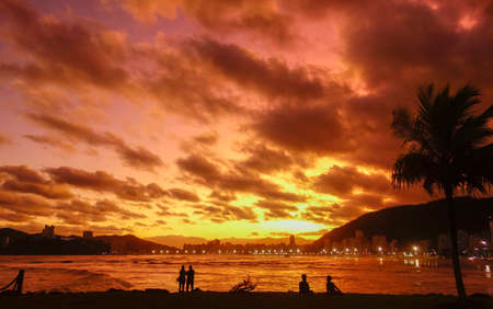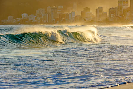 Incredible beautiful orange sunset with mountains in the background and big waves of Atlantic ocean at Ipanema beach in Rio de Janeiro, Brazil