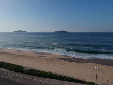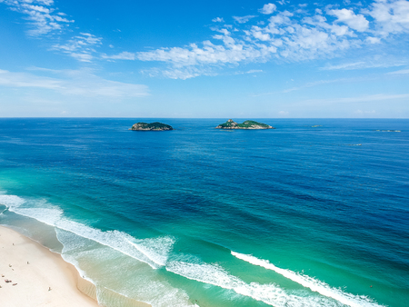 Drone photo of Barra da Tijuca beach with Ilhas Tijucas and Cagarras in the background, Rio de Janeiro