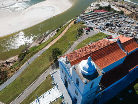 Aerial view of Saquarema and Itaúna beach in Rio de Janeiro. Famous for the waves and the church on top of the hill. Sunny day. drone photo.