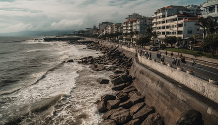 Breaking waves crash on rocky coastline at sunset generated by artificial intelligence